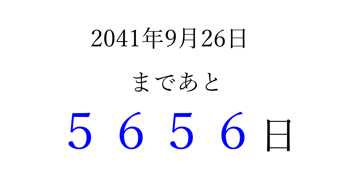 2041年9月26日(木)まで あと 9999 日です 追加すると、トップページからすぐ選べるようになります ※2026/04/02現在の結果です。 最新の状態に更新する ↓シェアして、タイムライン上にカウントダウンを表示しよう!↓ 📤 この結果を共有する Tweet シェア Threads Bluesky 別の日付でカウントダウン 2041年9月のカレンダー このページをブックマークに追加すると、いつでもカウントダウンを確認できます。 (PC: Ctrl+D / Mac: ⌘+D) hitome-notes.comでは以下のページも運営しています。 指定日と期間から日付を計算 | ガチャ確率計算・シミュレーション | プライバシー・ポリシー 運営者:Avocado
