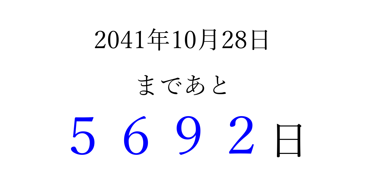 2041年10月28日(月)まで あと 9999 日です 追加すると、トップページからすぐ選べるようになります ※2026/03/29現在の結果です。 最新の状態に更新する ↓シェアして、タイムライン上にカウントダウンを表示しよう!↓ 📤 この結果を共有する Tweet シェア Threads Bluesky 別の日付でカウントダウン 2041年10月のカレンダー このページをブックマークに追加すると、いつでもカウントダウンを確認できます。 (PC: Ctrl+D / Mac: ⌘+D) hitome-notes.comでは以下のページも運営しています。 指定日と期間から日付を計算 | ガチャ確率計算・シミュレーション | プライバシー・ポリシー 運営者:Avocado