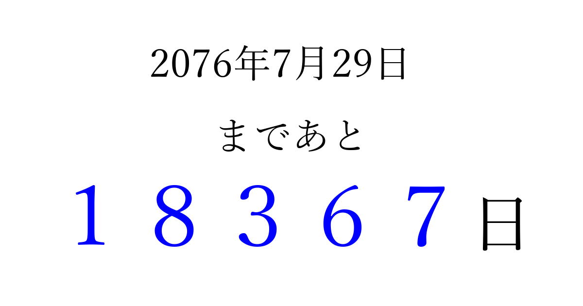 2076年7月29日(水)まで あと 99999 日です 追加すると、トップページからすぐ選べるようになります ※2026/04/16現在の結果です。 最新の状態に更新する ↓シェアして、タイムライン上にカウントダウンを表示しよう!↓ 📤 この結果を共有する Tweet シェア Threads Bluesky 別の日付でカウントダウン 2076年7月のカレンダー このページをブックマークに追加すると、いつでもカウントダウンを確認できます。 (PC: Ctrl+D / Mac: ⌘+D) hitome-notes.comでは以下のページも運営しています。 指定日と期間から日付を計算 | ガチャ確率計算・シミュレーション | プライバシー・ポリシー 運営者:Avocado
