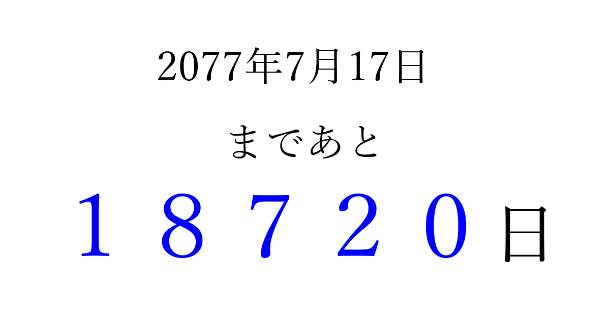 2077年7月17日(土)まで あと 99999 日です 追加すると、トップページからすぐ選べるようになります ※2026/04/16現在の結果です。 最新の状態に更新する ↓シェアして、タイムライン上にカウントダウンを表示しよう!↓ 📤 この結果を共有する Tweet シェア Threads Bluesky 別の日付でカウントダウン 2077年7月のカレンダー このページをブックマークに追加すると、いつでもカウントダウンを確認できます。 (PC: Ctrl+D / Mac: ⌘+D) hitome-notes.comでは以下のページも運営しています。 指定日と期間から日付を計算 | ガチャ確率計算・シミュレーション | プライバシー・ポリシー 運営者:Avocado