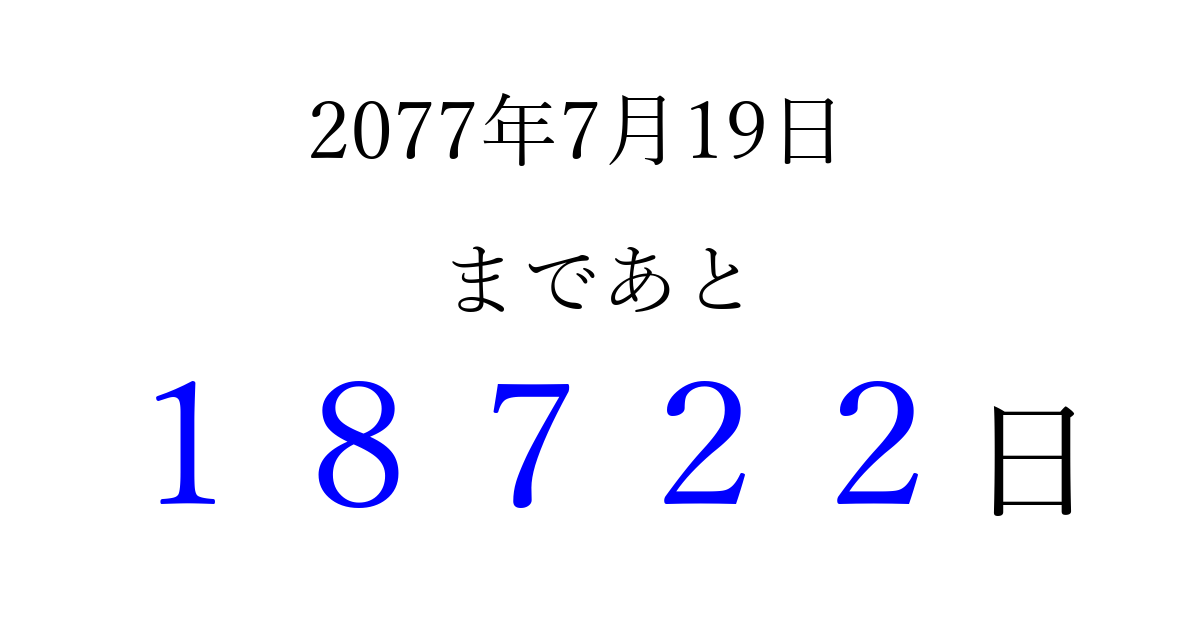 2077年7月19日(月)まで あと 99999 日です 追加すると、トップページからすぐ選べるようになります ※2026/04/16現在の結果です。 最新の状態に更新する ↓シェアして、タイムライン上にカウントダウンを表示しよう!↓ 📤 この結果を共有する Tweet シェア Threads Bluesky 別の日付でカウントダウン 2077年7月のカレンダー このページをブックマークに追加すると、いつでもカウントダウンを確認できます。 (PC: Ctrl+D / Mac: ⌘+D) hitome-notes.comでは以下のページも運営しています。 指定日と期間から日付を計算 | ガチャ確率計算・シミュレーション | プライバシー・ポリシー 運営者:Avocado