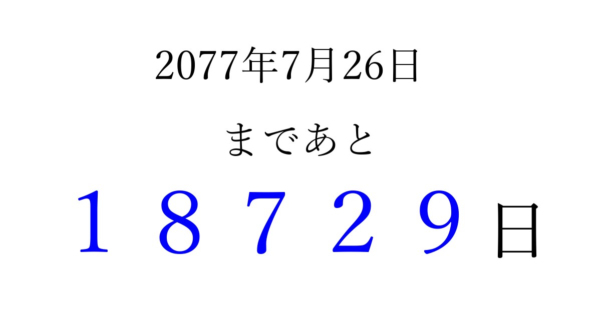 2077年7月26日(月)まで あと 99999 日です 追加すると、トップページからすぐ選べるようになります ※2026/04/16現在の結果です。 最新の状態に更新する ↓シェアして、タイムライン上にカウントダウンを表示しよう!↓ 📤 この結果を共有する Tweet シェア Threads Bluesky 別の日付でカウントダウン 2077年7月のカレンダー このページをブックマークに追加すると、いつでもカウントダウンを確認できます。 (PC: Ctrl+D / Mac: ⌘+D) hitome-notes.comでは以下のページも運営しています。 指定日と期間から日付を計算 | ガチャ確率計算・シミュレーション | プライバシー・ポリシー 運営者:Avocado