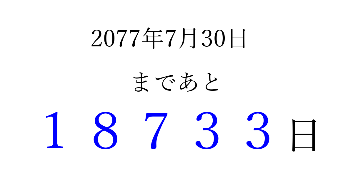 2077年7月30日(金)まで あと 99999 日です 追加すると、トップページからすぐ選べるようになります ※2026/04/16現在の結果です。 最新の状態に更新する ↓シェアして、タイムライン上にカウントダウンを表示しよう!↓ 📤 この結果を共有する Tweet シェア Threads Bluesky 別の日付でカウントダウン 2077年7月のカレンダー このページをブックマークに追加すると、いつでもカウントダウンを確認できます。 (PC: Ctrl+D / Mac: ⌘+D) hitome-notes.comでは以下のページも運営しています。 指定日と期間から日付を計算 | ガチャ確率計算・シミュレーション | プライバシー・ポリシー 運営者:Avocado