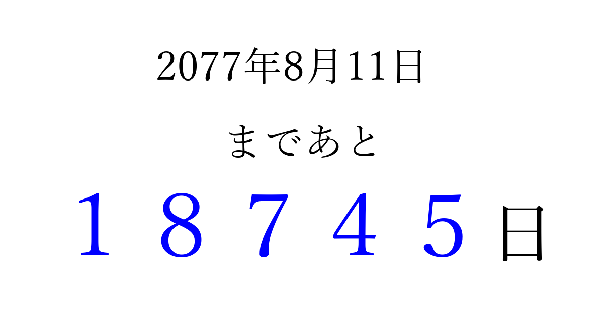 2077年8月11日(水)まで あと 99999 日です 追加すると、トップページからすぐ選べるようになります ※2026/04/16現在の結果です。 最新の状態に更新する ↓シェアして、タイムライン上にカウントダウンを表示しよう!↓ 📤 この結果を共有する Tweet シェア Threads Bluesky 別の日付でカウントダウン 2077年8月のカレンダー このページをブックマークに追加すると、いつでもカウントダウンを確認できます。 (PC: Ctrl+D / Mac: ⌘+D) hitome-notes.comでは以下のページも運営しています。 指定日と期間から日付を計算 | ガチャ確率計算・シミュレーション | プライバシー・ポリシー 運営者:Avocado