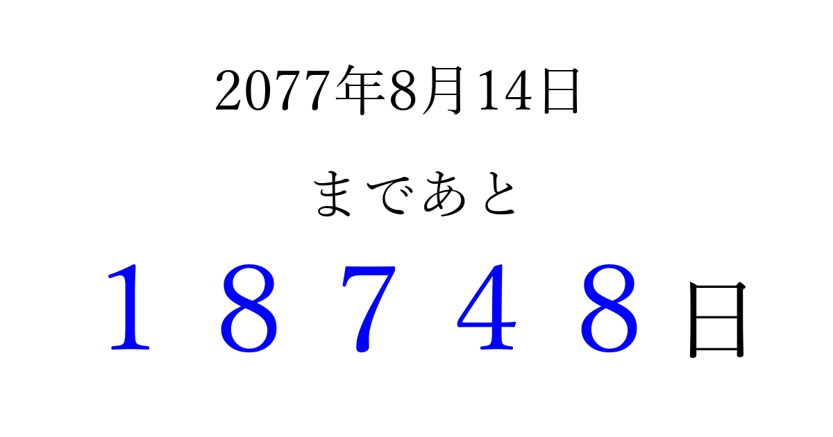 2077年8月14日(土)まで あと 99999 日です 追加すると、トップページからすぐ選べるようになります ※2026/04/16現在の結果です。 最新の状態に更新する ↓シェアして、タイムライン上にカウントダウンを表示しよう!↓ 📤 この結果を共有する Tweet シェア Threads Bluesky 別の日付でカウントダウン 2077年8月のカレンダー このページをブックマークに追加すると、いつでもカウントダウンを確認できます。 (PC: Ctrl+D / Mac: ⌘+D) hitome-notes.comでは以下のページも運営しています。 指定日と期間から日付を計算 | ガチャ確率計算・シミュレーション | プライバシー・ポリシー 運営者:Avocado