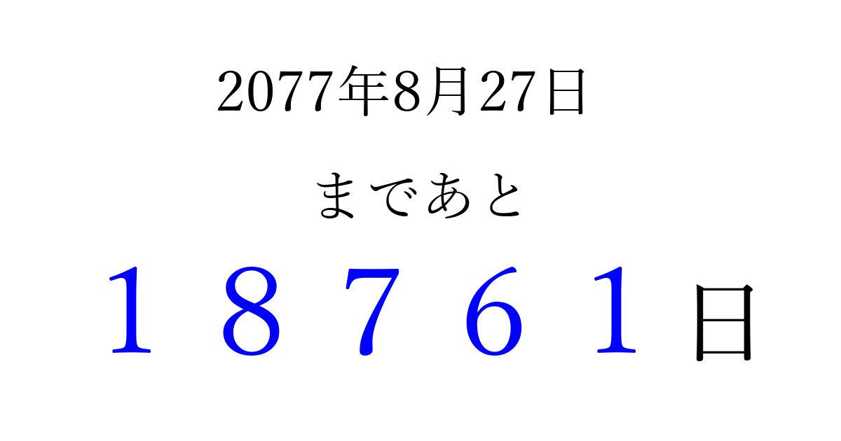 2077年8月27日(金)まで あと 99999 日です 追加すると、トップページからすぐ選べるようになります ※2026/04/16現在の結果です。 最新の状態に更新する ↓シェアして、タイムライン上にカウントダウンを表示しよう!↓ 📤 この結果を共有する Tweet シェア Threads Bluesky 別の日付でカウントダウン 2077年8月のカレンダー このページをブックマークに追加すると、いつでもカウントダウンを確認できます。 (PC: Ctrl+D / Mac: ⌘+D) hitome-notes.comでは以下のページも運営しています。 指定日と期間から日付を計算 | ガチャ確率計算・シミュレーション | プライバシー・ポリシー 運営者:Avocado