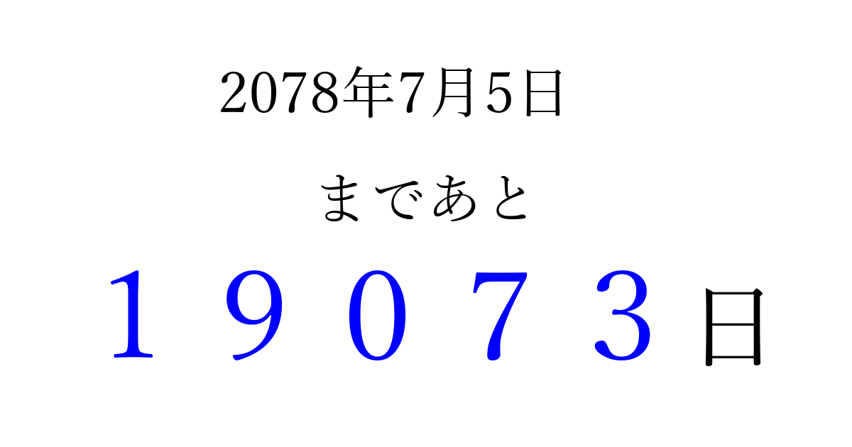 2078年7月5日(火)まで あと 99999 日です 追加すると、トップページからすぐ選べるようになります ※2026/04/16現在の結果です。 最新の状態に更新する ↓シェアして、タイムライン上にカウントダウンを表示しよう!↓ 📤 この結果を共有する Tweet シェア Threads Bluesky 別の日付でカウントダウン 2078年7月のカレンダー このページをブックマークに追加すると、いつでもカウントダウンを確認できます。 (PC: Ctrl+D / Mac: ⌘+D) hitome-notes.comでは以下のページも運営しています。 指定日と期間から日付を計算 | ガチャ確率計算・シミュレーション | プライバシー・ポリシー 運営者:Avocado