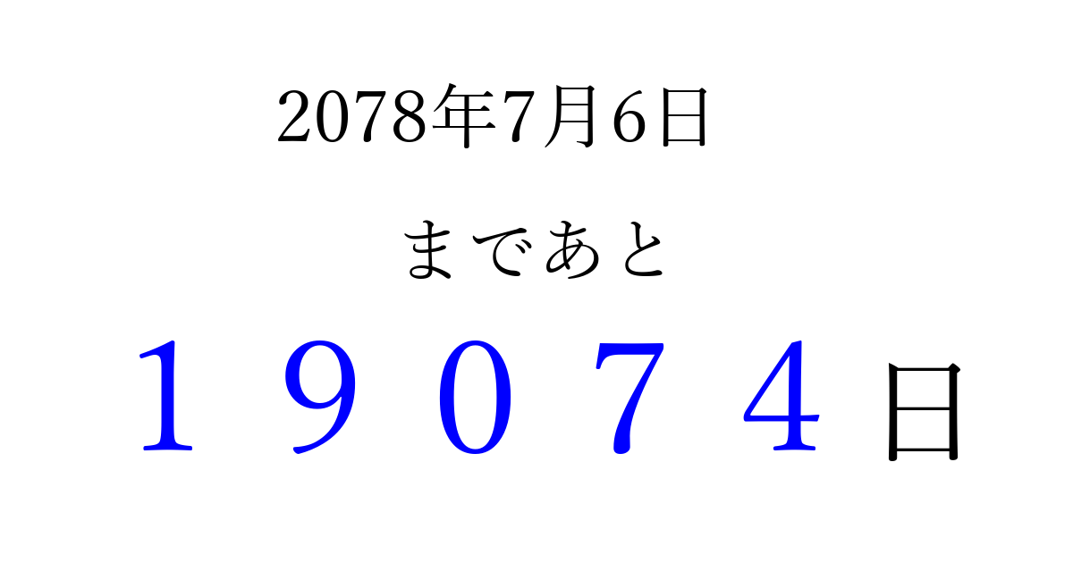 2078年7月6日(水)まで あと 99999 日です 追加すると、トップページからすぐ選べるようになります ※2026/04/16現在の結果です。 最新の状態に更新する ↓シェアして、タイムライン上にカウントダウンを表示しよう!↓ 📤 この結果を共有する Tweet シェア Threads Bluesky 別の日付でカウントダウン 2078年7月のカレンダー このページをブックマークに追加すると、いつでもカウントダウンを確認できます。 (PC: Ctrl+D / Mac: ⌘+D) hitome-notes.comでは以下のページも運営しています。 指定日と期間から日付を計算 | ガチャ確率計算・シミュレーション | プライバシー・ポリシー 運営者:Avocado