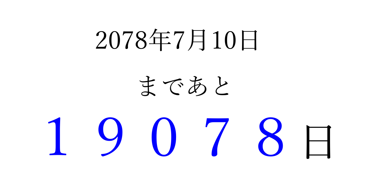 2078年7月10日(日)まで あと 99999 日です 追加すると、トップページからすぐ選べるようになります ※2026/04/16現在の結果です。 最新の状態に更新する ↓シェアして、タイムライン上にカウントダウンを表示しよう!↓ 📤 この結果を共有する Tweet シェア Threads Bluesky 別の日付でカウントダウン 2078年7月のカレンダー このページをブックマークに追加すると、いつでもカウントダウンを確認できます。 (PC: Ctrl+D / Mac: ⌘+D) hitome-notes.comでは以下のページも運営しています。 指定日と期間から日付を計算 | ガチャ確率計算・シミュレーション | プライバシー・ポリシー 運営者:Avocado