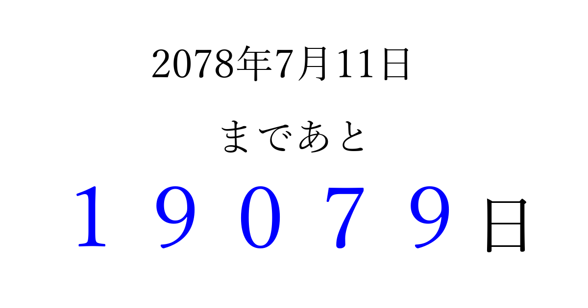 2078年7月11日(月)まで あと 99999 日です 追加すると、トップページからすぐ選べるようになります ※2026/04/16現在の結果です。 最新の状態に更新する ↓シェアして、タイムライン上にカウントダウンを表示しよう!↓ 📤 この結果を共有する Tweet シェア Threads Bluesky 別の日付でカウントダウン 2078年7月のカレンダー このページをブックマークに追加すると、いつでもカウントダウンを確認できます。 (PC: Ctrl+D / Mac: ⌘+D) hitome-notes.comでは以下のページも運営しています。 指定日と期間から日付を計算 | ガチャ確率計算・シミュレーション | プライバシー・ポリシー 運営者:Avocado