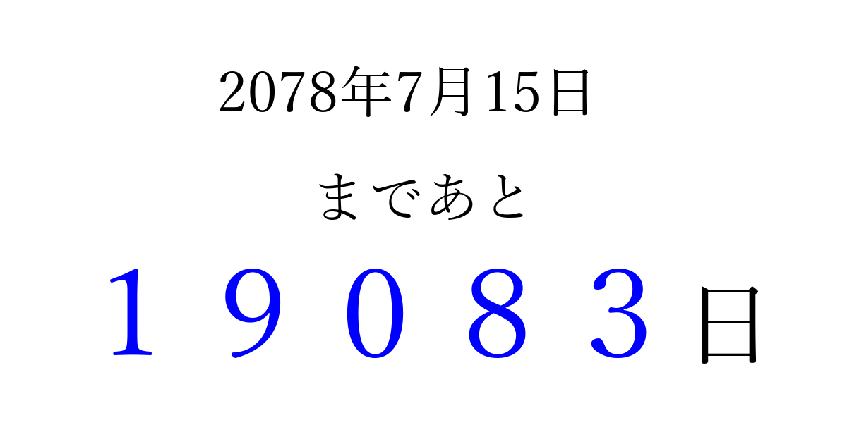 2078年7月15日(金)まで あと 99999 日です 追加すると、トップページからすぐ選べるようになります ※2026/04/16現在の結果です。 最新の状態に更新する ↓シェアして、タイムライン上にカウントダウンを表示しよう!↓ 📤 この結果を共有する Tweet シェア Threads Bluesky 別の日付でカウントダウン 2078年7月のカレンダー このページをブックマークに追加すると、いつでもカウントダウンを確認できます。 (PC: Ctrl+D / Mac: ⌘+D) hitome-notes.comでは以下のページも運営しています。 指定日と期間から日付を計算 | ガチャ確率計算・シミュレーション | プライバシー・ポリシー 運営者:Avocado