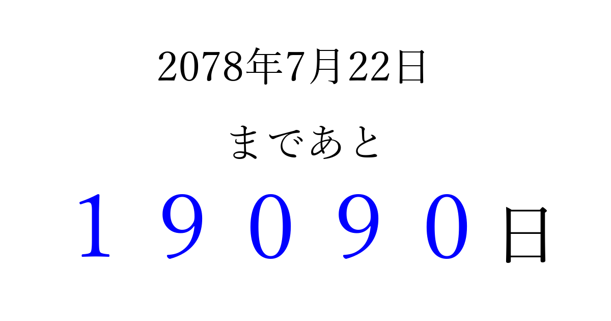 2078年7月22日(金)まで あと 99999 日です 追加すると、トップページからすぐ選べるようになります ※2026/04/16現在の結果です。 最新の状態に更新する ↓シェアして、タイムライン上にカウントダウンを表示しよう!↓ 📤 この結果を共有する Tweet シェア Threads Bluesky 別の日付でカウントダウン 2078年7月のカレンダー このページをブックマークに追加すると、いつでもカウントダウンを確認できます。 (PC: Ctrl+D / Mac: ⌘+D) hitome-notes.comでは以下のページも運営しています。 指定日と期間から日付を計算 | ガチャ確率計算・シミュレーション | プライバシー・ポリシー 運営者:Avocado