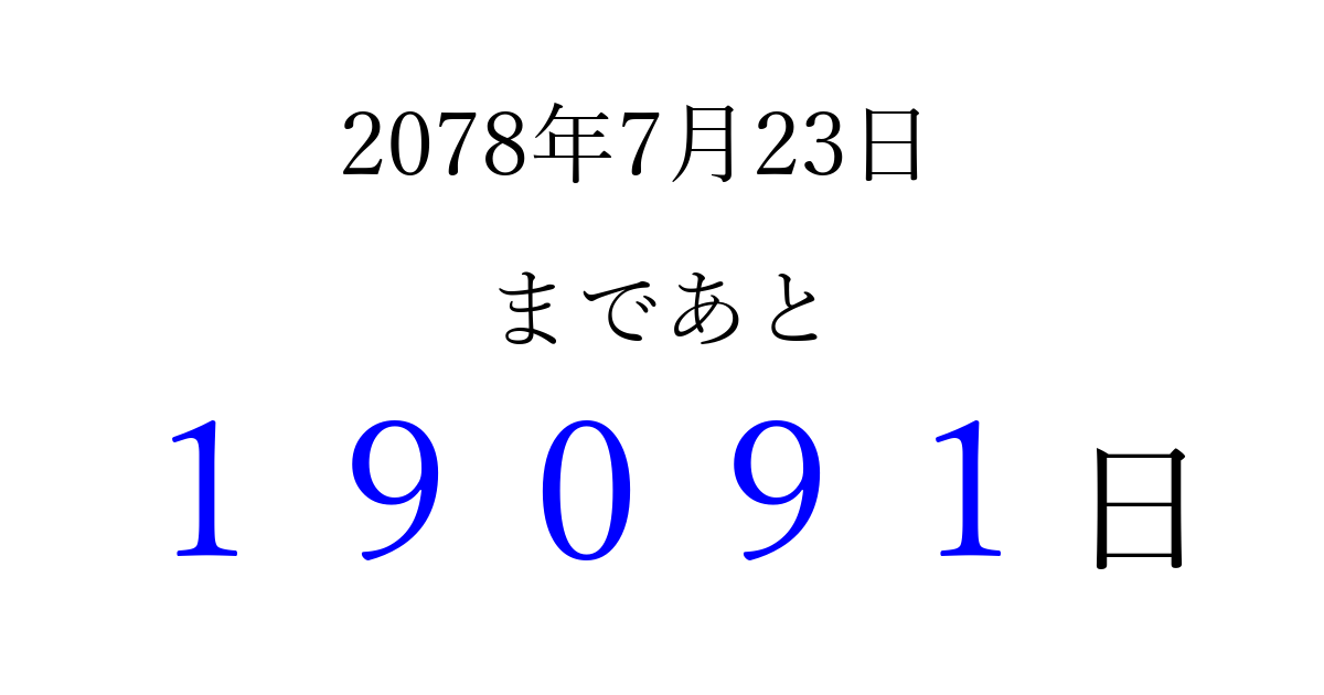 2078年7月23日(土)まで あと 99999 日です 追加すると、トップページからすぐ選べるようになります ※2026/04/16現在の結果です。 最新の状態に更新する ↓シェアして、タイムライン上にカウントダウンを表示しよう!↓ 📤 この結果を共有する Tweet シェア Threads Bluesky 別の日付でカウントダウン 2078年7月のカレンダー このページをブックマークに追加すると、いつでもカウントダウンを確認できます。 (PC: Ctrl+D / Mac: ⌘+D) hitome-notes.comでは以下のページも運営しています。 指定日と期間から日付を計算 | ガチャ確率計算・シミュレーション | プライバシー・ポリシー 運営者:Avocado