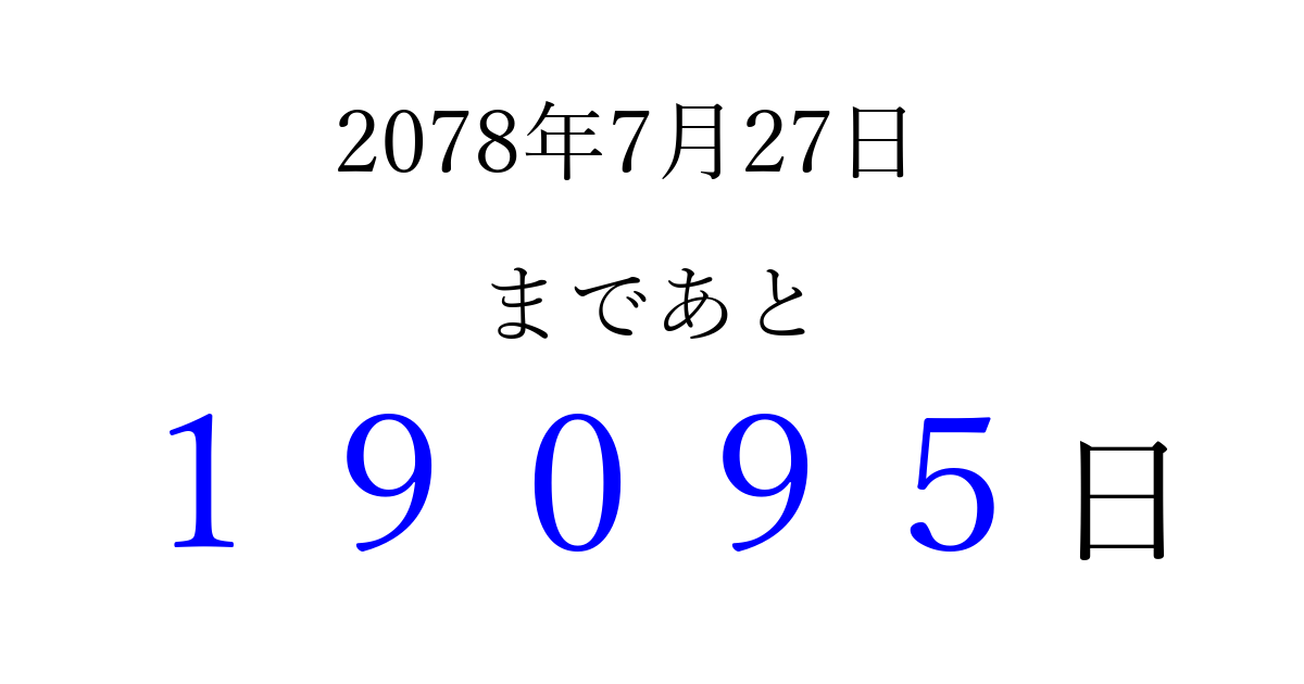 2078年7月27日(水)まで あと 99999 日です 追加すると、トップページからすぐ選べるようになります ※2026/04/16現在の結果です。 最新の状態に更新する ↓シェアして、タイムライン上にカウントダウンを表示しよう!↓ 📤 この結果を共有する Tweet シェア Threads Bluesky 別の日付でカウントダウン 2078年7月のカレンダー このページをブックマークに追加すると、いつでもカウントダウンを確認できます。 (PC: Ctrl+D / Mac: ⌘+D) hitome-notes.comでは以下のページも運営しています。 指定日と期間から日付を計算 | ガチャ確率計算・シミュレーション | プライバシー・ポリシー 運営者:Avocado