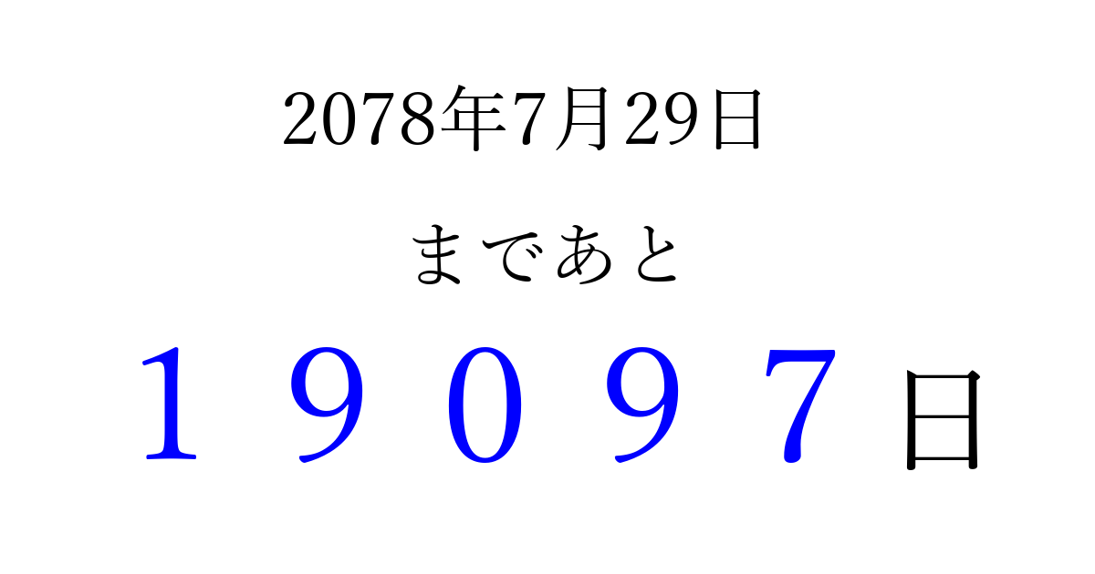 2078年7月29日(金)まで あと 99999 日です 追加すると、トップページからすぐ選べるようになります ※2026/04/16現在の結果です。 最新の状態に更新する ↓シェアして、タイムライン上にカウントダウンを表示しよう!↓ 📤 この結果を共有する Tweet シェア Threads Bluesky 別の日付でカウントダウン 2078年7月のカレンダー このページをブックマークに追加すると、いつでもカウントダウンを確認できます。 (PC: Ctrl+D / Mac: ⌘+D) hitome-notes.comでは以下のページも運営しています。 指定日と期間から日付を計算 | ガチャ確率計算・シミュレーション | プライバシー・ポリシー 運営者:Avocado