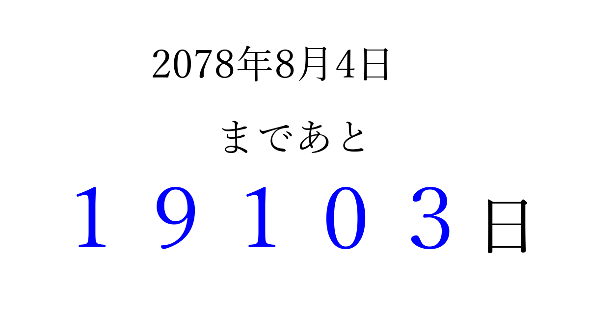 2078年8月4日(木)まで あと 99999 日です 追加すると、トップページからすぐ選べるようになります ※2026/04/16現在の結果です。 最新の状態に更新する ↓シェアして、タイムライン上にカウントダウンを表示しよう!↓ 📤 この結果を共有する Tweet シェア Threads Bluesky 別の日付でカウントダウン 2078年8月のカレンダー このページをブックマークに追加すると、いつでもカウントダウンを確認できます。 (PC: Ctrl+D / Mac: ⌘+D) hitome-notes.comでは以下のページも運営しています。 指定日と期間から日付を計算 | ガチャ確率計算・シミュレーション | プライバシー・ポリシー 運営者:Avocado