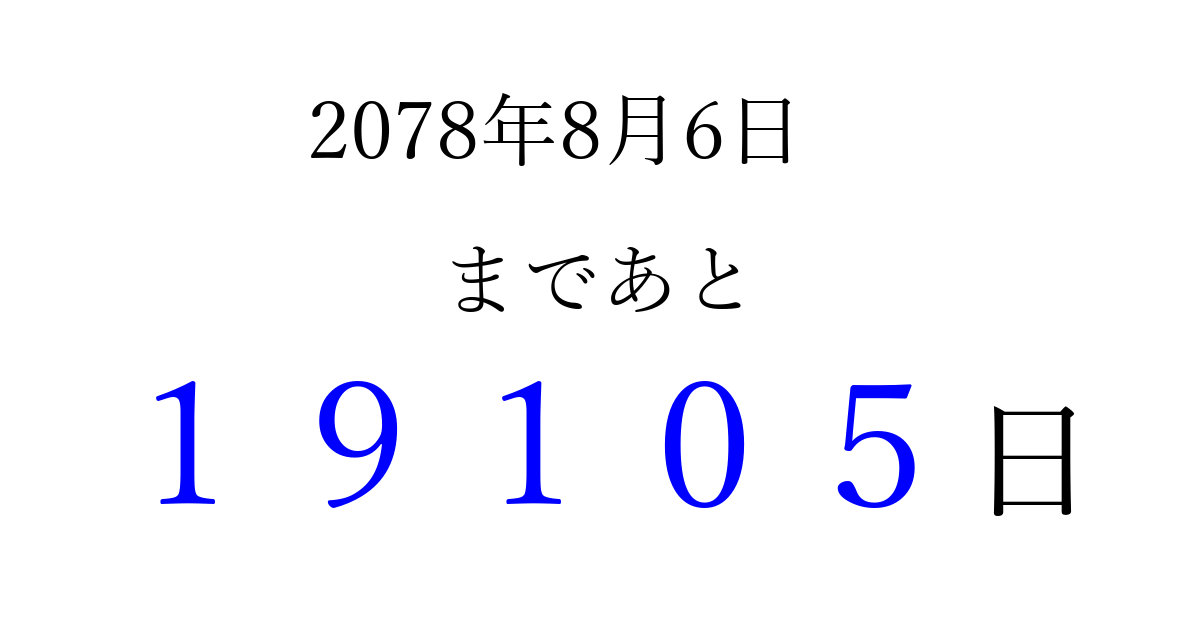 2078年8月6日(土)まで あと 99999 日です 追加すると、トップページからすぐ選べるようになります ※2026/04/16現在の結果です。 最新の状態に更新する ↓シェアして、タイムライン上にカウントダウンを表示しよう!↓ 📤 この結果を共有する Tweet シェア Threads Bluesky 別の日付でカウントダウン 2078年8月のカレンダー このページをブックマークに追加すると、いつでもカウントダウンを確認できます。 (PC: Ctrl+D / Mac: ⌘+D) hitome-notes.comでは以下のページも運営しています。 指定日と期間から日付を計算 | ガチャ確率計算・シミュレーション | プライバシー・ポリシー 運営者:Avocado
