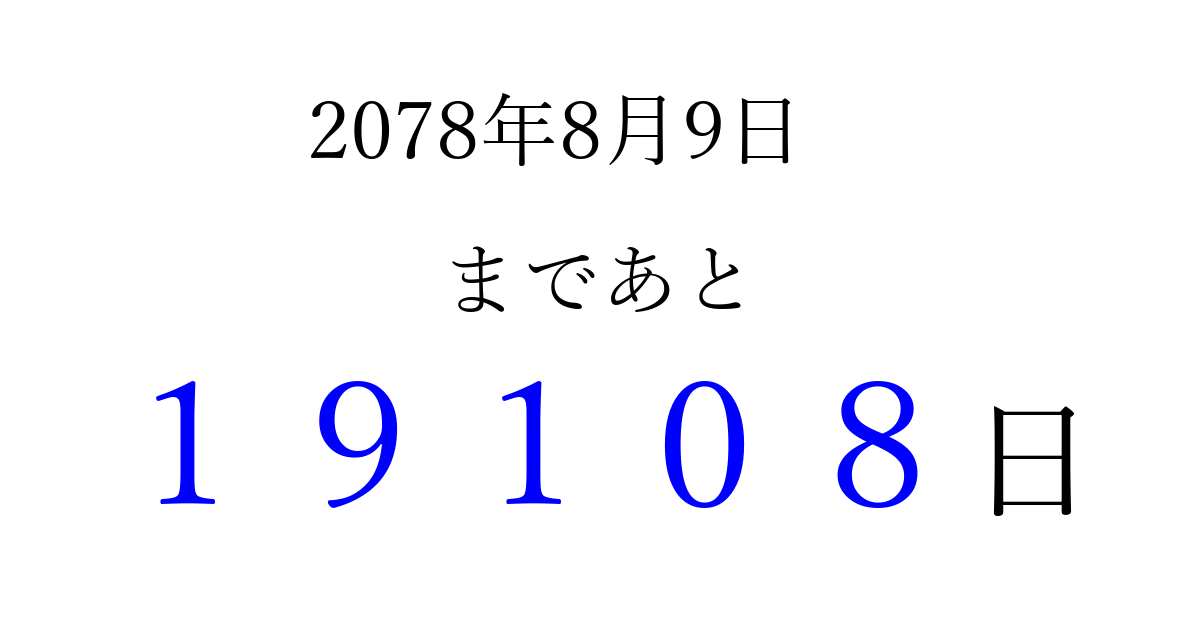 2078年8月9日(火)まで あと 99999 日です 追加すると、トップページからすぐ選べるようになります ※2026/04/16現在の結果です。 最新の状態に更新する ↓シェアして、タイムライン上にカウントダウンを表示しよう!↓ 📤 この結果を共有する Tweet シェア Threads Bluesky 別の日付でカウントダウン 2078年8月のカレンダー このページをブックマークに追加すると、いつでもカウントダウンを確認できます。 (PC: Ctrl+D / Mac: ⌘+D) hitome-notes.comでは以下のページも運営しています。 指定日と期間から日付を計算 | ガチャ確率計算・シミュレーション | プライバシー・ポリシー 運営者:Avocado