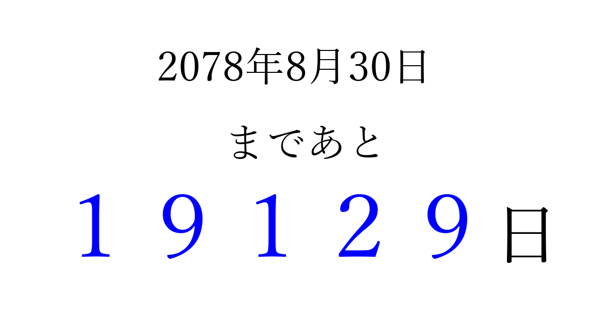 2078年8月30日(火)まで あと 99999 日です 追加すると、トップページからすぐ選べるようになります ※2026/04/16現在の結果です。 最新の状態に更新する ↓シェアして、タイムライン上にカウントダウンを表示しよう!↓ 📤 この結果を共有する Tweet シェア Threads Bluesky 別の日付でカウントダウン 2078年8月のカレンダー このページをブックマークに追加すると、いつでもカウントダウンを確認できます。 (PC: Ctrl+D / Mac: ⌘+D) hitome-notes.comでは以下のページも運営しています。 指定日と期間から日付を計算 | ガチャ確率計算・シミュレーション | プライバシー・ポリシー 運営者:Avocado