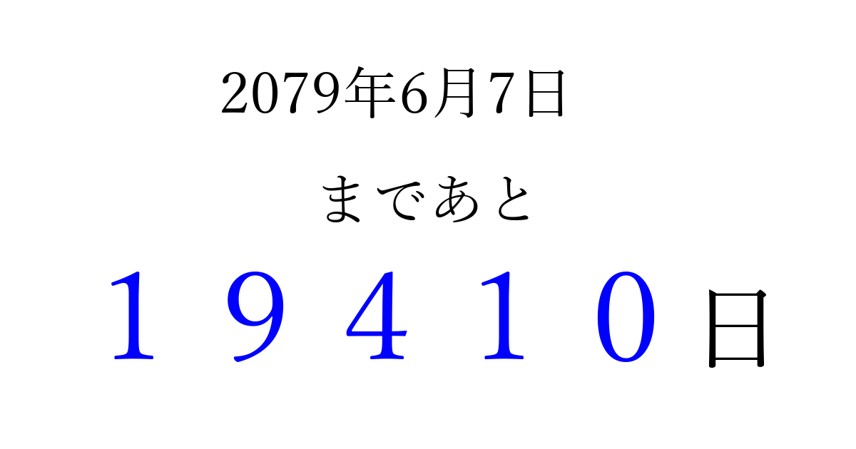 2079年6月7日(水)まで あと 99999 日です 追加すると、トップページからすぐ選べるようになります ※2026/04/16現在の結果です。 最新の状態に更新する ↓シェアして、タイムライン上にカウントダウンを表示しよう!↓ 📤 この結果を共有する Tweet シェア Threads Bluesky 別の日付でカウントダウン 2079年6月のカレンダー このページをブックマークに追加すると、いつでもカウントダウンを確認できます。 (PC: Ctrl+D / Mac: ⌘+D) hitome-notes.comでは以下のページも運営しています。 指定日と期間から日付を計算 | ガチャ確率計算・シミュレーション | プライバシー・ポリシー 運営者:Avocado