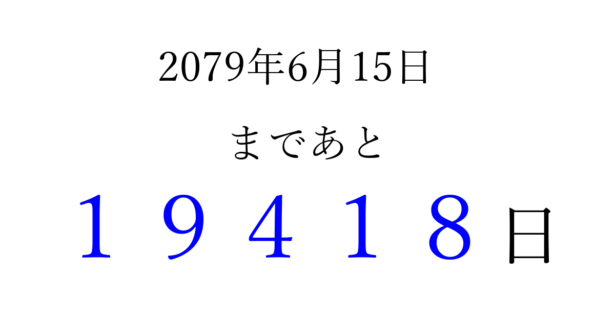 2079年6月15日(木)まで あと 99999 日です 追加すると、トップページからすぐ選べるようになります ※2026/04/16現在の結果です。 最新の状態に更新する ↓シェアして、タイムライン上にカウントダウンを表示しよう!↓ 📤 この結果を共有する Tweet シェア Threads Bluesky 別の日付でカウントダウン 2079年6月のカレンダー このページをブックマークに追加すると、いつでもカウントダウンを確認できます。 (PC: Ctrl+D / Mac: ⌘+D) hitome-notes.comでは以下のページも運営しています。 指定日と期間から日付を計算 | ガチャ確率計算・シミュレーション | プライバシー・ポリシー 運営者:Avocado