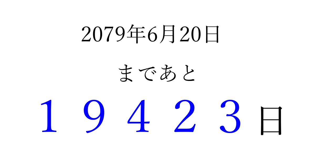 2079年6月20日(火)まで あと 99999 日です 追加すると、トップページからすぐ選べるようになります ※2026/04/16現在の結果です。 最新の状態に更新する ↓シェアして、タイムライン上にカウントダウンを表示しよう!↓ 📤 この結果を共有する Tweet シェア Threads Bluesky 別の日付でカウントダウン 2079年6月のカレンダー このページをブックマークに追加すると、いつでもカウントダウンを確認できます。 (PC: Ctrl+D / Mac: ⌘+D) hitome-notes.comでは以下のページも運営しています。 指定日と期間から日付を計算 | ガチャ確率計算・シミュレーション | プライバシー・ポリシー 運営者:Avocado