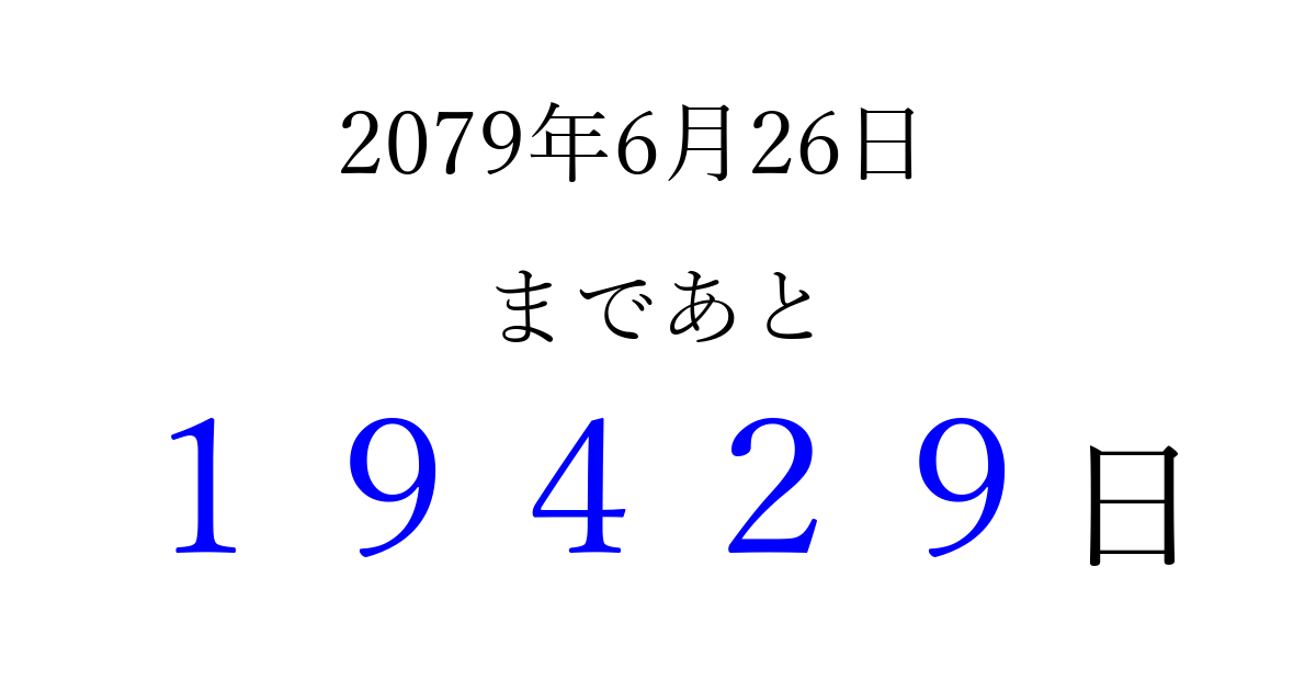 2079年6月26日(月)まで あと 99999 日です 追加すると、トップページからすぐ選べるようになります ※2026/04/16現在の結果です。 最新の状態に更新する ↓シェアして、タイムライン上にカウントダウンを表示しよう!↓ 📤 この結果を共有する Tweet シェア Threads Bluesky 別の日付でカウントダウン 2079年6月のカレンダー このページをブックマークに追加すると、いつでもカウントダウンを確認できます。 (PC: Ctrl+D / Mac: ⌘+D) hitome-notes.comでは以下のページも運営しています。 指定日と期間から日付を計算 | ガチャ確率計算・シミュレーション | プライバシー・ポリシー 運営者:Avocado