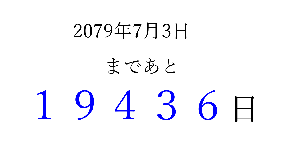 2079年7月3日(月)まで あと 99999 日です 追加すると、トップページからすぐ選べるようになります ※2026/04/16現在の結果です。 最新の状態に更新する ↓シェアして、タイムライン上にカウントダウンを表示しよう!↓ 📤 この結果を共有する Tweet シェア Threads Bluesky 別の日付でカウントダウン 2079年7月のカレンダー このページをブックマークに追加すると、いつでもカウントダウンを確認できます。 (PC: Ctrl+D / Mac: ⌘+D) hitome-notes.comでは以下のページも運営しています。 指定日と期間から日付を計算 | ガチャ確率計算・シミュレーション | プライバシー・ポリシー 運営者:Avocado