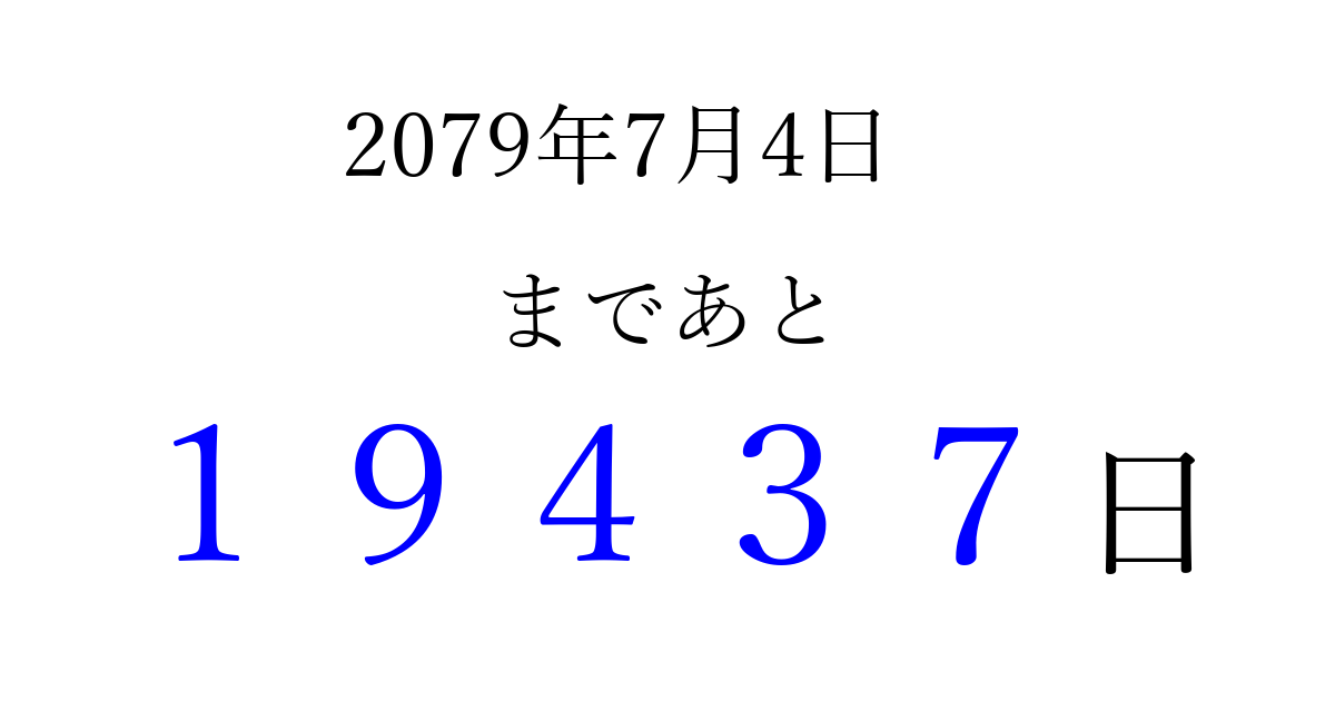 2079年7月4日(火)まで あと 99999 日です 追加すると、トップページからすぐ選べるようになります ※2026/04/16現在の結果です。 最新の状態に更新する ↓シェアして、タイムライン上にカウントダウンを表示しよう!↓ 📤 この結果を共有する Tweet シェア Threads Bluesky 別の日付でカウントダウン 2079年7月のカレンダー このページをブックマークに追加すると、いつでもカウントダウンを確認できます。 (PC: Ctrl+D / Mac: ⌘+D) hitome-notes.comでは以下のページも運営しています。 指定日と期間から日付を計算 | ガチャ確率計算・シミュレーション | プライバシー・ポリシー 運営者:Avocado