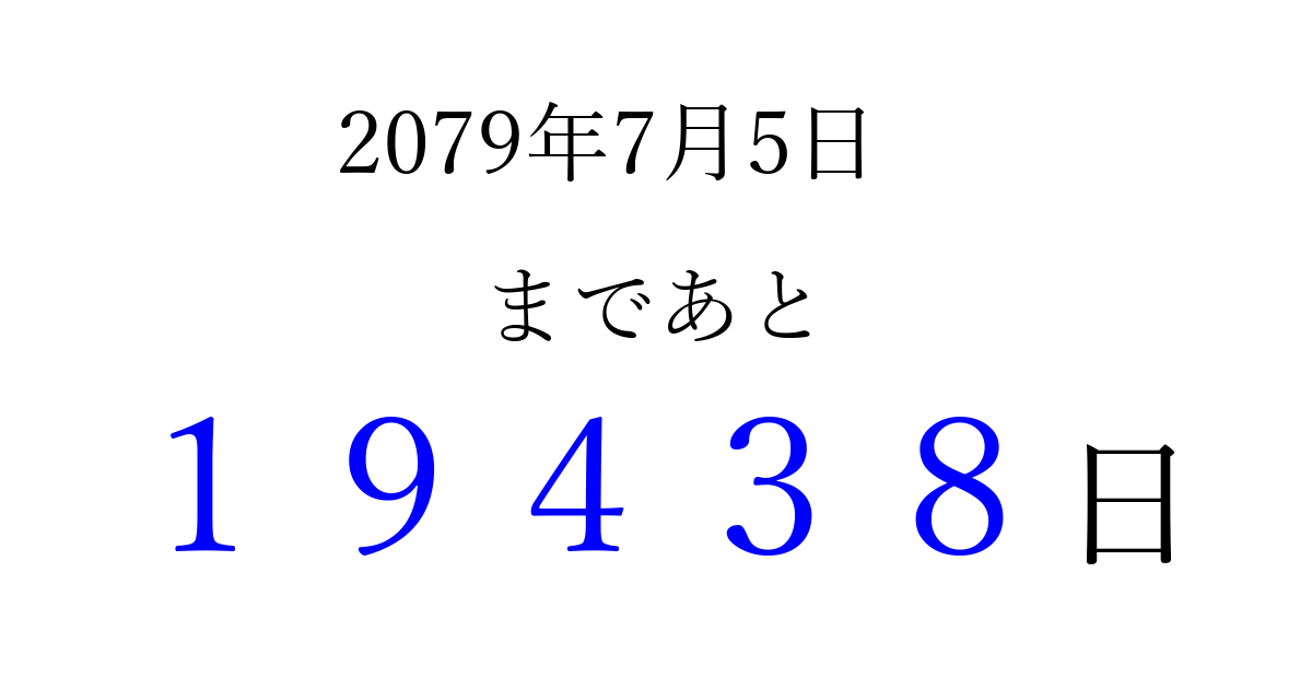 2079年7月5日(水)まで あと 99999 日です 追加すると、トップページからすぐ選べるようになります ※2026/04/16現在の結果です。 最新の状態に更新する ↓シェアして、タイムライン上にカウントダウンを表示しよう!↓ 📤 この結果を共有する Tweet シェア Threads Bluesky 別の日付でカウントダウン 2079年7月のカレンダー このページをブックマークに追加すると、いつでもカウントダウンを確認できます。 (PC: Ctrl+D / Mac: ⌘+D) hitome-notes.comでは以下のページも運営しています。 指定日と期間から日付を計算 | ガチャ確率計算・シミュレーション | プライバシー・ポリシー 運営者:Avocado