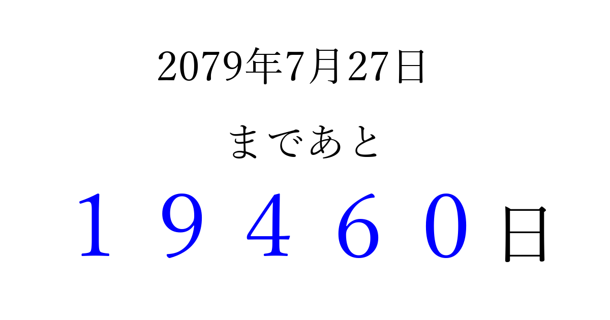 2079年7月27日(木)まで あと 99999 日です 追加すると、トップページからすぐ選べるようになります ※2026/04/16現在の結果です。 最新の状態に更新する ↓シェアして、タイムライン上にカウントダウンを表示しよう!↓ 📤 この結果を共有する Tweet シェア Threads Bluesky 別の日付でカウントダウン 2079年7月のカレンダー このページをブックマークに追加すると、いつでもカウントダウンを確認できます。 (PC: Ctrl+D / Mac: ⌘+D) hitome-notes.comでは以下のページも運営しています。 指定日と期間から日付を計算 | ガチャ確率計算・シミュレーション | プライバシー・ポリシー 運営者:Avocado
