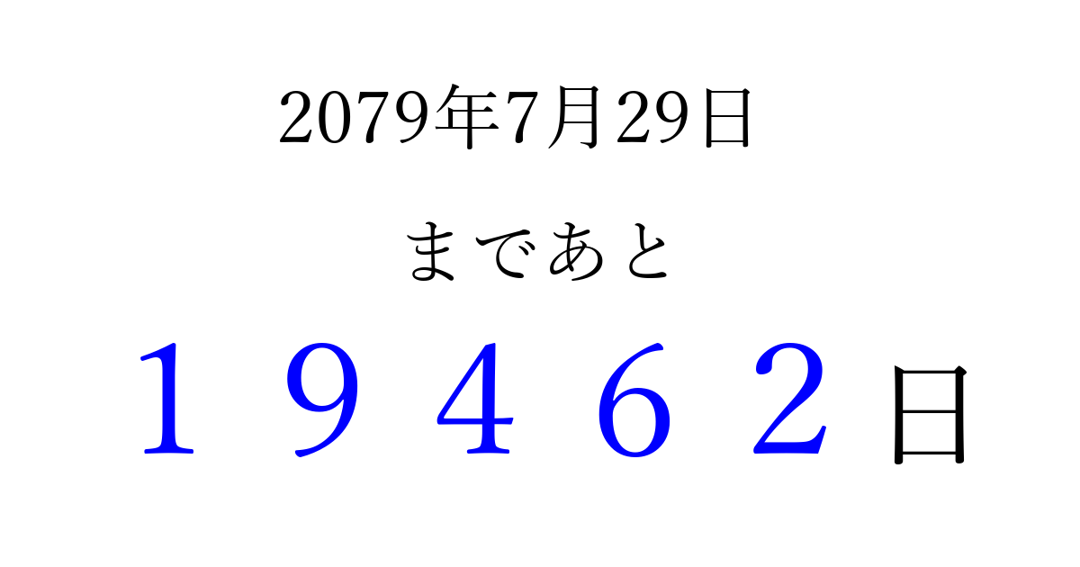 2079年7月29日(土)まで あと 99999 日です 追加すると、トップページからすぐ選べるようになります ※2026/04/16現在の結果です。 最新の状態に更新する ↓シェアして、タイムライン上にカウントダウンを表示しよう!↓ 📤 この結果を共有する Tweet シェア Threads Bluesky 別の日付でカウントダウン 2079年7月のカレンダー このページをブックマークに追加すると、いつでもカウントダウンを確認できます。 (PC: Ctrl+D / Mac: ⌘+D) hitome-notes.comでは以下のページも運営しています。 指定日と期間から日付を計算 | ガチャ確率計算・シミュレーション | プライバシー・ポリシー 運営者:Avocado