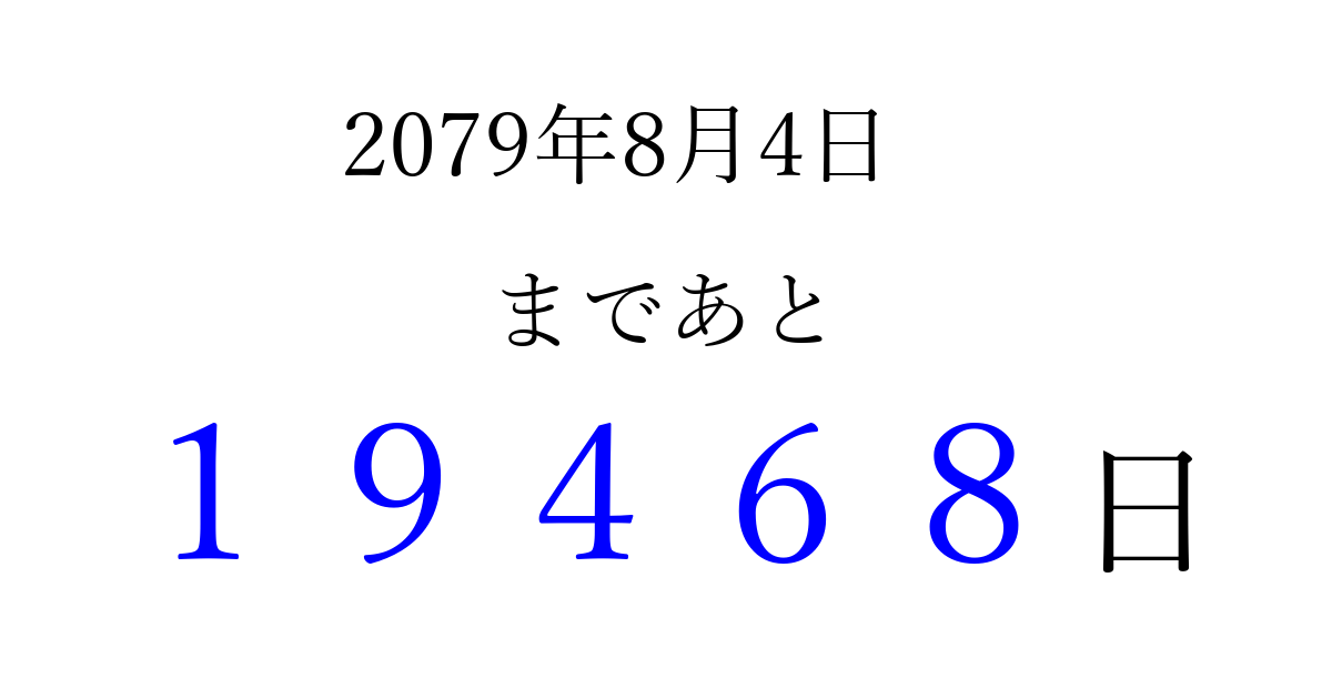 2079年8月4日(金)まで あと 99999 日です 追加すると、トップページからすぐ選べるようになります ※2026/04/16現在の結果です。 最新の状態に更新する ↓シェアして、タイムライン上にカウントダウンを表示しよう!↓ 📤 この結果を共有する Tweet シェア Threads Bluesky 別の日付でカウントダウン 2079年8月のカレンダー このページをブックマークに追加すると、いつでもカウントダウンを確認できます。 (PC: Ctrl+D / Mac: ⌘+D) hitome-notes.comでは以下のページも運営しています。 指定日と期間から日付を計算 | ガチャ確率計算・シミュレーション | プライバシー・ポリシー 運営者:Avocado