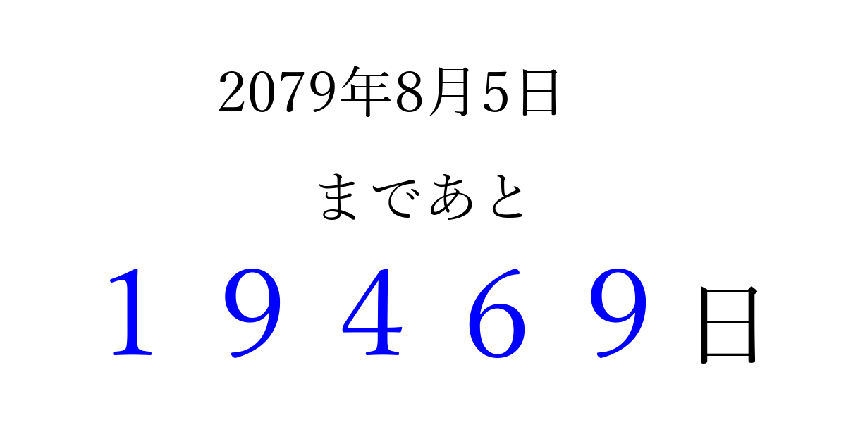 2079年8月5日(土)まで あと 99999 日です 追加すると、トップページからすぐ選べるようになります ※2026/04/16現在の結果です。 最新の状態に更新する ↓シェアして、タイムライン上にカウントダウンを表示しよう!↓ 📤 この結果を共有する Tweet シェア Threads Bluesky 別の日付でカウントダウン 2079年8月のカレンダー このページをブックマークに追加すると、いつでもカウントダウンを確認できます。 (PC: Ctrl+D / Mac: ⌘+D) hitome-notes.comでは以下のページも運営しています。 指定日と期間から日付を計算 | ガチャ確率計算・シミュレーション | プライバシー・ポリシー 運営者:Avocado