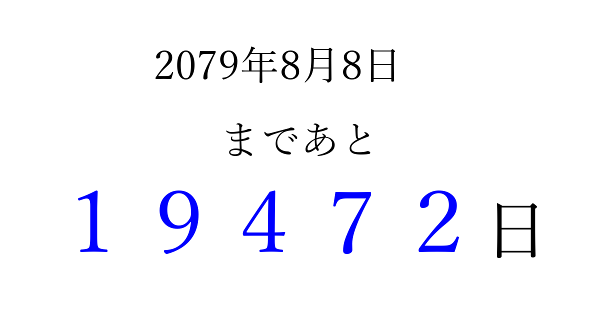 2079年8月8日(火)まで あと 99999 日です 追加すると、トップページからすぐ選べるようになります ※2026/04/16現在の結果です。 最新の状態に更新する ↓シェアして、タイムライン上にカウントダウンを表示しよう!↓ 📤 この結果を共有する Tweet シェア Threads Bluesky 別の日付でカウントダウン 2079年8月のカレンダー このページをブックマークに追加すると、いつでもカウントダウンを確認できます。 (PC: Ctrl+D / Mac: ⌘+D) hitome-notes.comでは以下のページも運営しています。 指定日と期間から日付を計算 | ガチャ確率計算・シミュレーション | プライバシー・ポリシー 運営者:Avocado