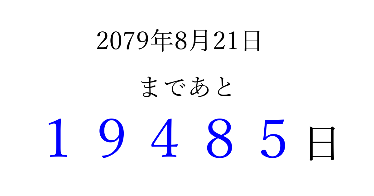 2079年8月21日(月)まで あと 99999 日です 追加すると、トップページからすぐ選べるようになります ※2026/04/16現在の結果です。 最新の状態に更新する ↓シェアして、タイムライン上にカウントダウンを表示しよう!↓ 📤 この結果を共有する Tweet シェア Threads Bluesky 別の日付でカウントダウン 2079年8月のカレンダー このページをブックマークに追加すると、いつでもカウントダウンを確認できます。 (PC: Ctrl+D / Mac: ⌘+D) hitome-notes.comでは以下のページも運営しています。 指定日と期間から日付を計算 | ガチャ確率計算・シミュレーション | プライバシー・ポリシー 運営者:Avocado