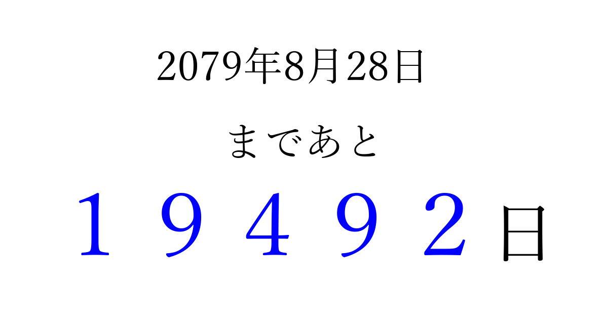 2079年8月28日(月)まで あと 99999 日です 追加すると、トップページからすぐ選べるようになります ※2026/04/16現在の結果です。 最新の状態に更新する ↓シェアして、タイムライン上にカウントダウンを表示しよう!↓ 📤 この結果を共有する Tweet シェア Threads Bluesky 別の日付でカウントダウン 2079年8月のカレンダー このページをブックマークに追加すると、いつでもカウントダウンを確認できます。 (PC: Ctrl+D / Mac: ⌘+D) hitome-notes.comでは以下のページも運営しています。 指定日と期間から日付を計算 | ガチャ確率計算・シミュレーション | プライバシー・ポリシー 運営者:Avocado