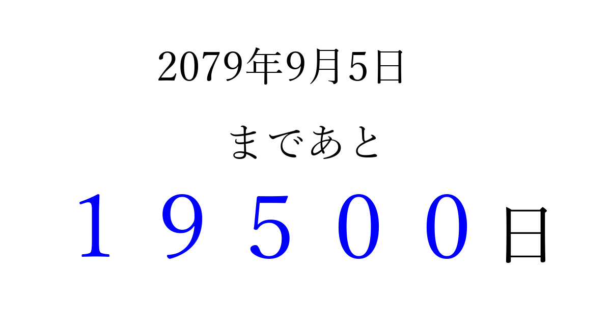 2079年9月5日(火)まで あと 99999 日です 追加すると、トップページからすぐ選べるようになります ※2026/04/16現在の結果です。 最新の状態に更新する ↓シェアして、タイムライン上にカウントダウンを表示しよう!↓ 📤 この結果を共有する Tweet シェア Threads Bluesky 別の日付でカウントダウン 2079年9月のカレンダー このページをブックマークに追加すると、いつでもカウントダウンを確認できます。 (PC: Ctrl+D / Mac: ⌘+D) hitome-notes.comでは以下のページも運営しています。 指定日と期間から日付を計算 | ガチャ確率計算・シミュレーション | プライバシー・ポリシー 運営者:Avocado