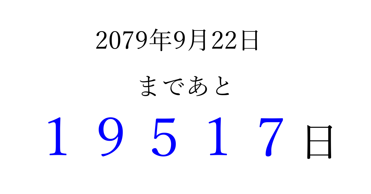 2079年9月22日(金)まで あと 99999 日です 追加すると、トップページからすぐ選べるようになります ※2026/04/16現在の結果です。 最新の状態に更新する ↓シェアして、タイムライン上にカウントダウンを表示しよう!↓ 📤 この結果を共有する Tweet シェア Threads Bluesky 別の日付でカウントダウン 2079年9月のカレンダー このページをブックマークに追加すると、いつでもカウントダウンを確認できます。 (PC: Ctrl+D / Mac: ⌘+D) hitome-notes.comでは以下のページも運営しています。 指定日と期間から日付を計算 | ガチャ確率計算・シミュレーション | プライバシー・ポリシー 運営者:Avocado