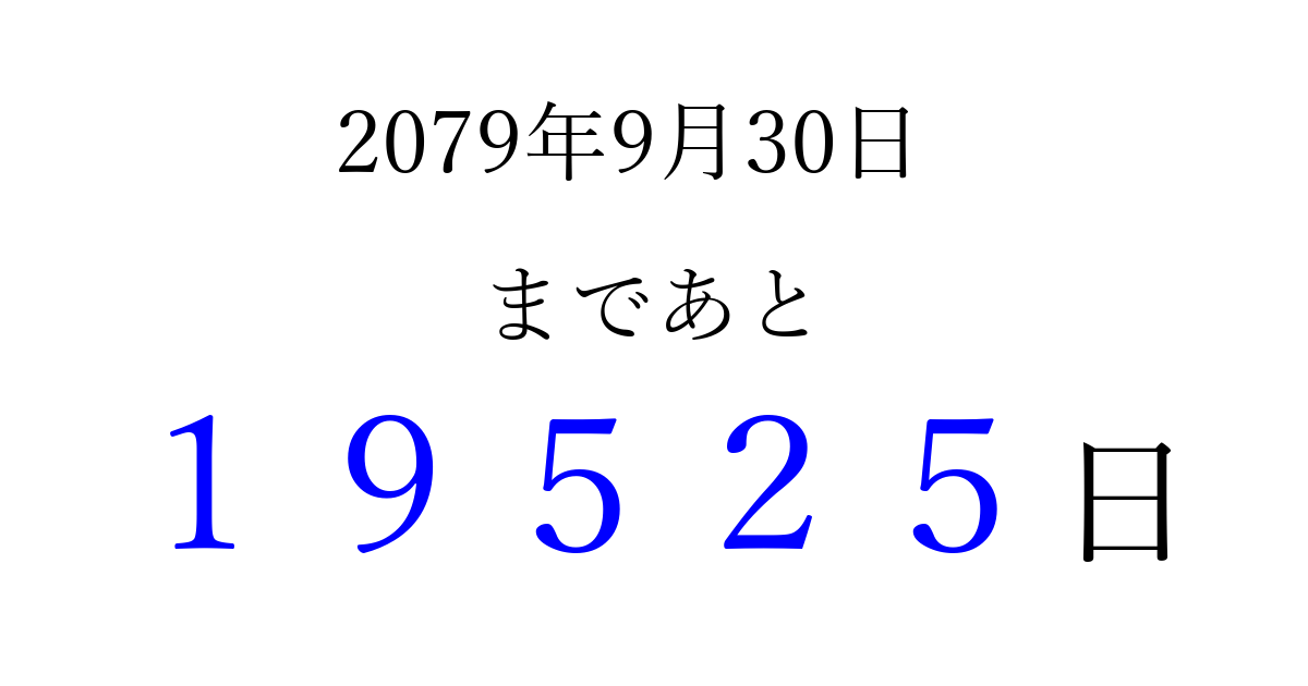 2079年9月30日(土)まで あと 99999 日です 追加すると、トップページからすぐ選べるようになります ※2026/04/16現在の結果です。 最新の状態に更新する ↓シェアして、タイムライン上にカウントダウンを表示しよう!↓ 📤 この結果を共有する Tweet シェア Threads Bluesky 別の日付でカウントダウン 2079年9月のカレンダー このページをブックマークに追加すると、いつでもカウントダウンを確認できます。 (PC: Ctrl+D / Mac: ⌘+D) hitome-notes.comでは以下のページも運営しています。 指定日と期間から日付を計算 | ガチャ確率計算・シミュレーション | プライバシー・ポリシー 運営者:Avocado