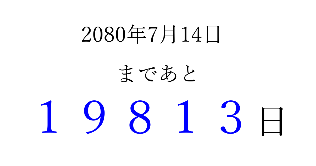 2080年7月14日(日)まで あと 99999 日です 追加すると、トップページからすぐ選べるようになります ※2026/04/16現在の結果です。 最新の状態に更新する ↓シェアして、タイムライン上にカウントダウンを表示しよう!↓ 📤 この結果を共有する Tweet シェア Threads Bluesky 別の日付でカウントダウン 2080年7月のカレンダー このページをブックマークに追加すると、いつでもカウントダウンを確認できます。 (PC: Ctrl+D / Mac: ⌘+D) hitome-notes.comでは以下のページも運営しています。 指定日と期間から日付を計算 | ガチャ確率計算・シミュレーション | プライバシー・ポリシー 運営者:Avocado