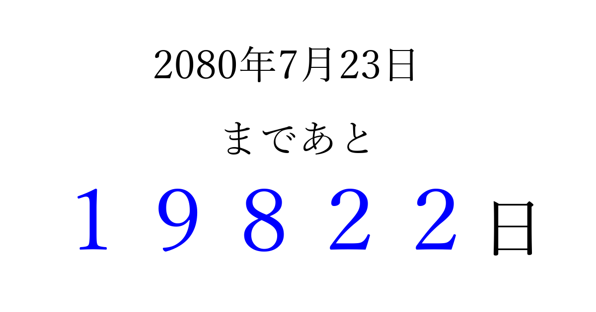 2080年7月23日(火)まで あと 99999 日です 追加すると、トップページからすぐ選べるようになります ※2026/04/16現在の結果です。 最新の状態に更新する ↓シェアして、タイムライン上にカウントダウンを表示しよう!↓ 📤 この結果を共有する Tweet シェア Threads Bluesky 別の日付でカウントダウン 2080年7月のカレンダー このページをブックマークに追加すると、いつでもカウントダウンを確認できます。 (PC: Ctrl+D / Mac: ⌘+D) hitome-notes.comでは以下のページも運営しています。 指定日と期間から日付を計算 | ガチャ確率計算・シミュレーション | プライバシー・ポリシー 運営者:Avocado
