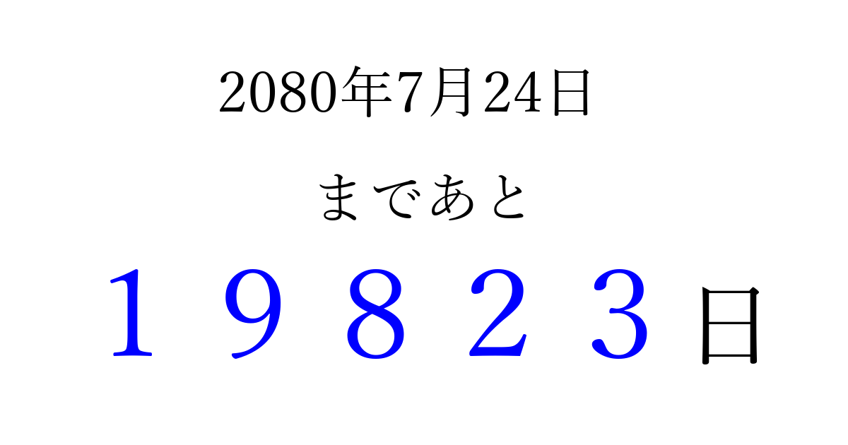 2080年7月24日(水)まで あと 99999 日です 追加すると、トップページからすぐ選べるようになります ※2026/04/16現在の結果です。 最新の状態に更新する ↓シェアして、タイムライン上にカウントダウンを表示しよう!↓ 📤 この結果を共有する Tweet シェア Threads Bluesky 別の日付でカウントダウン 2080年7月のカレンダー このページをブックマークに追加すると、いつでもカウントダウンを確認できます。 (PC: Ctrl+D / Mac: ⌘+D) hitome-notes.comでは以下のページも運営しています。 指定日と期間から日付を計算 | ガチャ確率計算・シミュレーション | プライバシー・ポリシー 運営者:Avocado