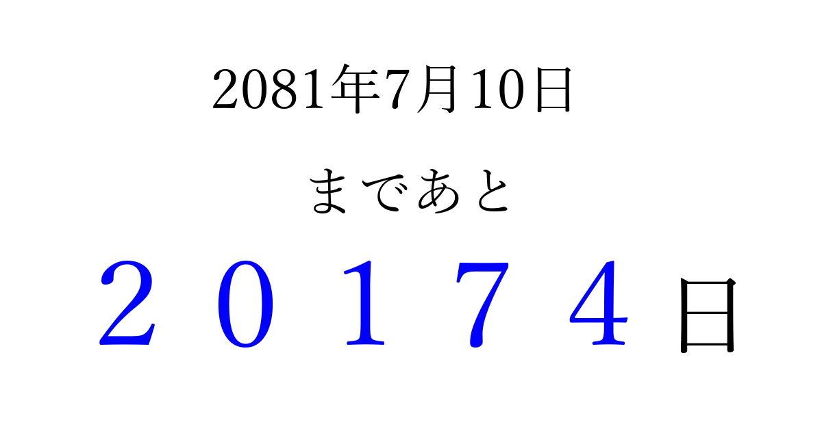 2081年7月10日(木)まで あと 99999 日です 追加すると、トップページからすぐ選べるようになります ※2026/04/16現在の結果です。 最新の状態に更新する ↓シェアして、タイムライン上にカウントダウンを表示しよう!↓ 📤 この結果を共有する Tweet シェア Threads Bluesky 別の日付でカウントダウン 2081年7月のカレンダー このページをブックマークに追加すると、いつでもカウントダウンを確認できます。 (PC: Ctrl+D / Mac: ⌘+D) hitome-notes.comでは以下のページも運営しています。 指定日と期間から日付を計算 | ガチャ確率計算・シミュレーション | プライバシー・ポリシー 運営者:Avocado
