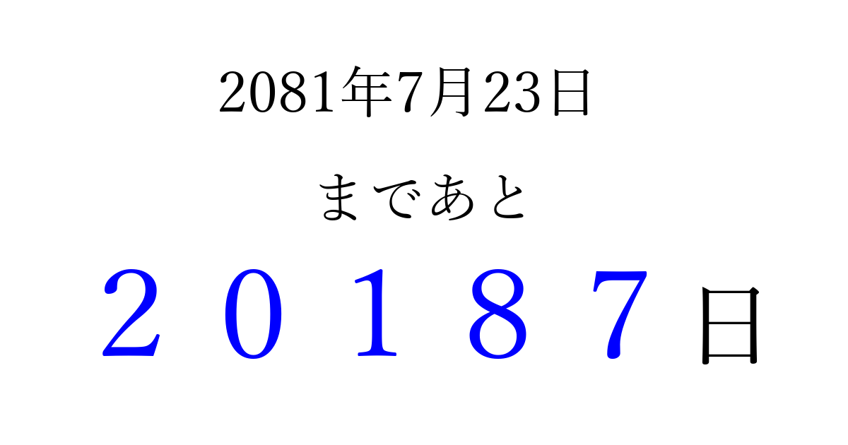 2081年7月23日(水)まで あと 99999 日です 追加すると、トップページからすぐ選べるようになります ※2026/04/16現在の結果です。 最新の状態に更新する ↓シェアして、タイムライン上にカウントダウンを表示しよう!↓ 📤 この結果を共有する Tweet シェア Threads Bluesky 別の日付でカウントダウン 2081年7月のカレンダー このページをブックマークに追加すると、いつでもカウントダウンを確認できます。 (PC: Ctrl+D / Mac: ⌘+D) hitome-notes.comでは以下のページも運営しています。 指定日と期間から日付を計算 | ガチャ確率計算・シミュレーション | プライバシー・ポリシー 運営者:Avocado