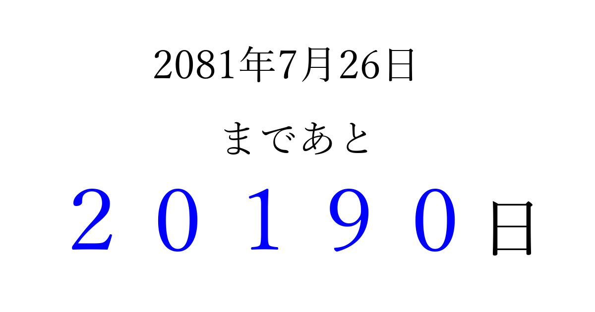2081年7月26日(土)まで あと 99999 日です 追加すると、トップページからすぐ選べるようになります ※2026/04/16現在の結果です。 最新の状態に更新する ↓シェアして、タイムライン上にカウントダウンを表示しよう!↓ 📤 この結果を共有する Tweet シェア Threads Bluesky 別の日付でカウントダウン 2081年7月のカレンダー このページをブックマークに追加すると、いつでもカウントダウンを確認できます。 (PC: Ctrl+D / Mac: ⌘+D) hitome-notes.comでは以下のページも運営しています。 指定日と期間から日付を計算 | ガチャ確率計算・シミュレーション | プライバシー・ポリシー 運営者:Avocado