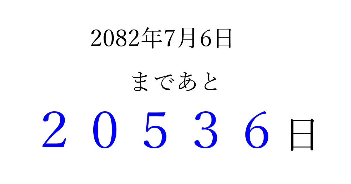 2082年7月6日(月)まで あと 99999 日です 追加すると、トップページからすぐ選べるようになります ※2026/04/15現在の結果です。 最新の状態に更新する ↓シェアして、タイムライン上にカウントダウンを表示しよう!↓ 📤 この結果を共有する Tweet シェア Threads Bluesky 別の日付でカウントダウン 2082年7月のカレンダー このページをブックマークに追加すると、いつでもカウントダウンを確認できます。 (PC: Ctrl+D / Mac: ⌘+D) hitome-notes.comでは以下のページも運営しています。 指定日と期間から日付を計算 | ガチャ確率計算・シミュレーション | プライバシー・ポリシー 運営者:Avocado