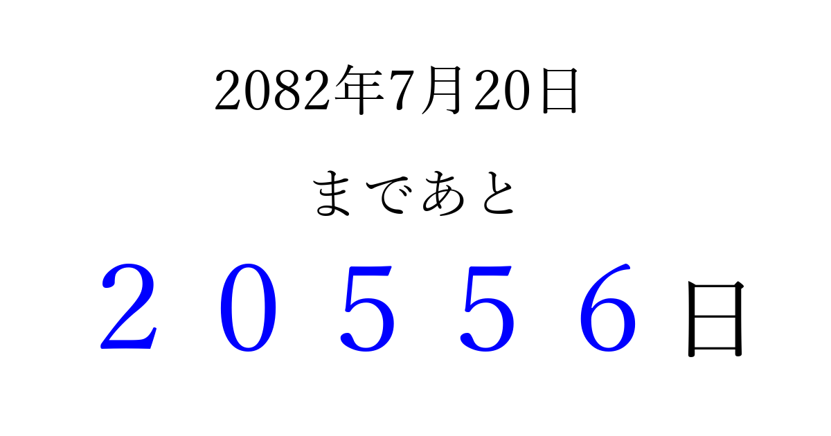 2082年7月20日(月)まで あと 99999 日です 追加すると、トップページからすぐ選べるようになります ※2026/04/09現在の結果です。 最新の状態に更新する ↓シェアして、タイムライン上にカウントダウンを表示しよう!↓ 📤 この結果を共有する Tweet シェア Threads Bluesky 別の日付でカウントダウン 2082年7月のカレンダー このページをブックマークに追加すると、いつでもカウントダウンを確認できます。 (PC: Ctrl+D / Mac: ⌘+D) hitome-notes.comでは以下のページも運営しています。 指定日と期間から日付を計算 | ガチャ確率計算・シミュレーション | プライバシー・ポリシー 運営者:Avocado