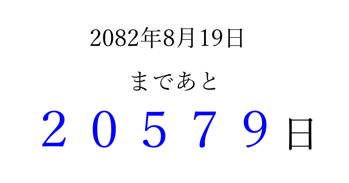 2082年8月19日(水)まで あと 99999 日です 追加すると、トップページからすぐ選べるようになります ※2026/04/16現在の結果です。 最新の状態に更新する ↓シェアして、タイムライン上にカウントダウンを表示しよう!↓ 📤 この結果を共有する Tweet シェア Threads Bluesky 別の日付でカウントダウン 2082年8月のカレンダー このページをブックマークに追加すると、いつでもカウントダウンを確認できます。 (PC: Ctrl+D / Mac: ⌘+D) hitome-notes.comでは以下のページも運営しています。 指定日と期間から日付を計算 | ガチャ確率計算・シミュレーション | プライバシー・ポリシー 運営者:Avocado