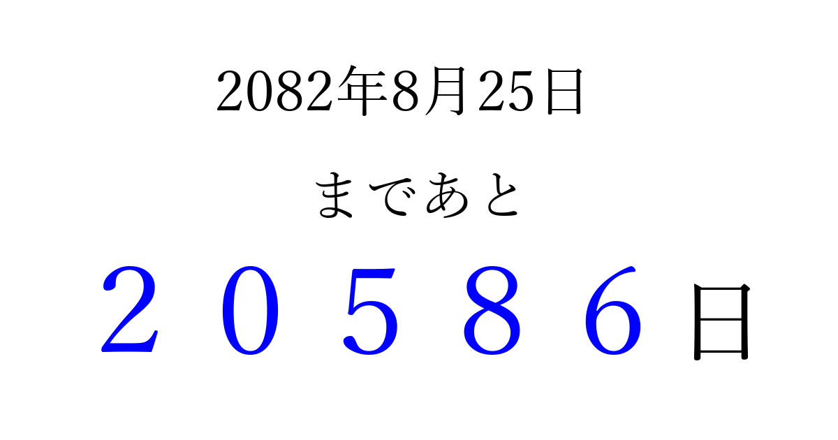 2082年8月25日(火)まで あと 99999 日です 追加すると、トップページからすぐ選べるようになります ※2026/04/15現在の結果です。 最新の状態に更新する ↓シェアして、タイムライン上にカウントダウンを表示しよう!↓ 📤 この結果を共有する Tweet シェア Threads Bluesky 別の日付でカウントダウン 2082年8月のカレンダー このページをブックマークに追加すると、いつでもカウントダウンを確認できます。 (PC: Ctrl+D / Mac: ⌘+D) hitome-notes.comでは以下のページも運営しています。 指定日と期間から日付を計算 | ガチャ確率計算・シミュレーション | プライバシー・ポリシー 運営者:Avocado